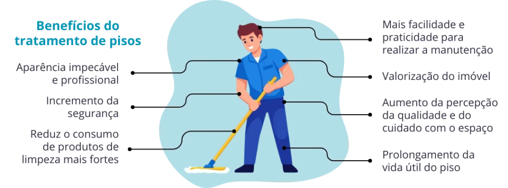 São diversos os benefícios do tratamento de pisos, que vai muito além do mero aspecto estético. Este processo aumenta a segurança do local, traz mais conforto aos frequentadores de um ambiente, facilita a manutenção e gera economia aos negócios no longo prazo, reduzindo o desgaste dos materiais.