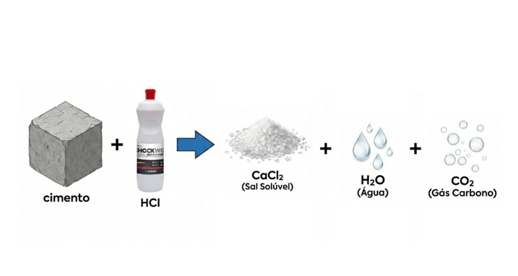 Imagem ilustrativa de uma reação química entre cimento e um limpador ácido. O cimento, uma sujeira insolúvel, age com o limpador ácido, gerando um sal solúvel, água e gás carbônico. O sal solúvel é facilmente removível na limpeza.