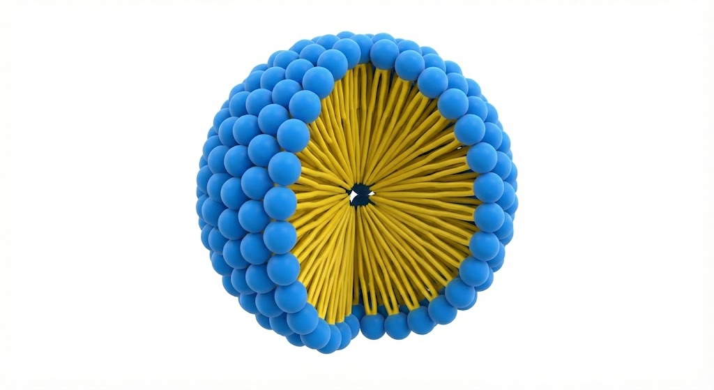 Imagem ilustrativa de uma micela. A micela é a junção de vários tensoativos. Quando em contato com a gordura, envolvem a molécula formando uma emulsão. A emulsão é a mistura de dois líquidos que, em condições normais, não se misturam (como a água e o óleo)