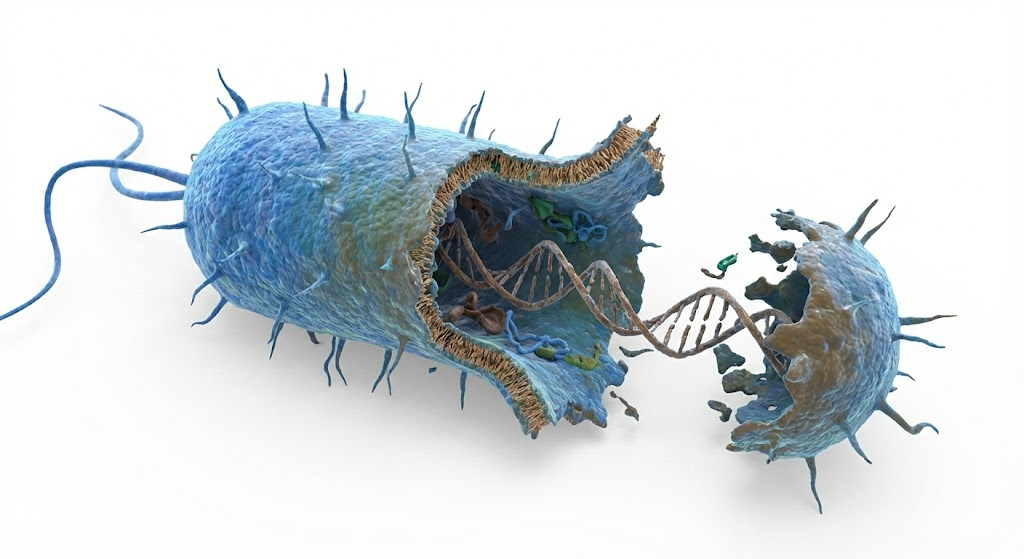 Imagem ilustrativa da desnaturação de uma bactéria. O desinfetante age destruindo ou inativando os microrganismos por diferentes mecanismos, desde que utilizado na concentração, tempo de contato e condições validadas em estudos laboratoriais.