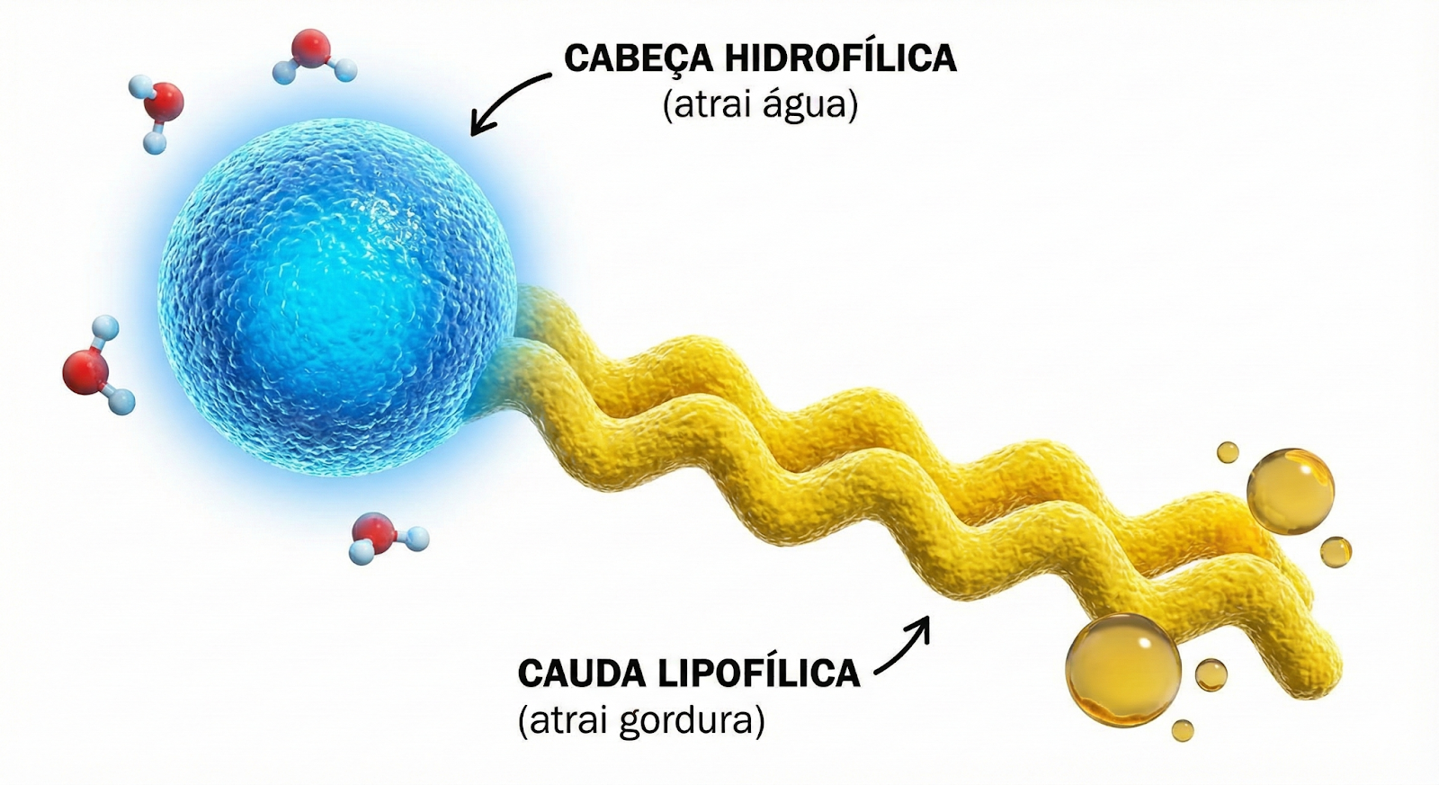 Imagem ilustrativa de um tensoativo. Sua “cabeça” é hidrofílica, ou seja, tem afinidade com a água. Já a sua “cauda” é lipofílica, ou seja, tem afinidade com a gordura.