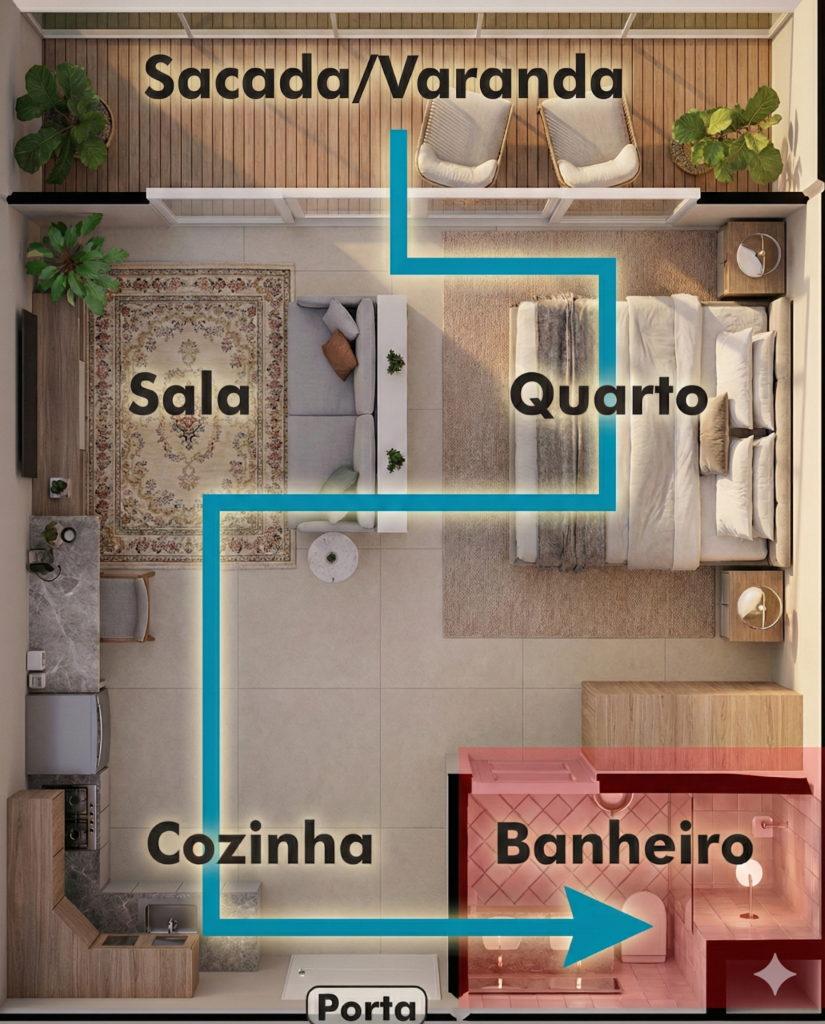 Imagem da ordem correta de limpeza em um quarto de hotel. O banheiro tende a ser o local de maior concentração de germes, portanto, para evitar contaminação cruzada e preservar melhor os materiais, é importante deixá-lo para o final.