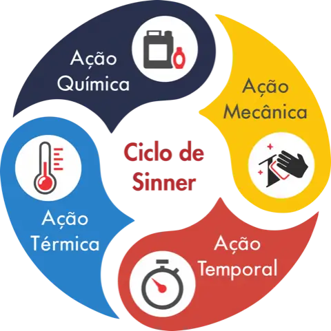 O Ciclo de Sinner mostra os processos envolvidos em uma limpeza de forma bem didática. A combinação de quatro ações — química, térmica, mecânica e temporal — é o que torna a limpeza eficaz.